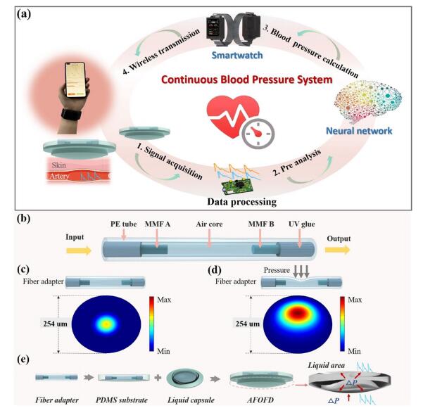 [1] Ma L-Y, Chen W-W, Gao R-L, Liu L-S, Zhu M-L, Wang Y-J, Wu Z-S, Li H-J, Gu D-F, Yang Y-J. China cardiovascular diseases report 2018: an updated summary. J Geriatr Cardiology. 2020;17:1. [2] Radovanovic CAT, Santos LAd, Carvalho MDdB, Marcon SS. Arterial Hypertension and other risk factors associated with cardiovascular diseases among adults. Revista latino-americana de enfermagem. 2014;22: 547–553. [3] Liu S, Li Y, Zeng X, Wang H, Yin P, Wang L, Liu Y, Liu J, Qi J, Ran S. Burden of cardiovascular diseases in China, 1990–2016: findings from the 2016 global burden of disease study. JAMA Cardiology. 2019;4:342–52. [4] Allender S, Scarborough P, Peto V, Rayner M, Leal J, Luengo-Fernandez R, Gray A. European Heart. Network. 2008;3:11–35. [5] Zhou B, Carrillo-Larco RM, Danaei G, Riley LM, Paciorek CJ, Stevens GA, Gregg EW, Bennett JE, Solomon B, Singleton RK. Worldwide trends in hypertension prevalence and progress in treatment and control from 1990 to 2019: a pooled analysis of 1201 population-representative studies with 104 million participants. Lancet. 2021;398:957–80. [6] Imai Y, Sasaki S, Minami N, Munakata M, Hashimoto J, Sakuma H, Sakuma M, Watanabe N, Imai K, Sekino H. The accuracy and performance of the A&D TM 2421, a new ambulatory blood pressure monitoring device based on the cuff-oscillometric method and the Korotkoff sound technique. Am J Hypertens. 1992;5:719–26. [7] Geddes L, Voelz M, Combs C, Reiner D, Babbs CF. Characterization of the oscillometric method for measuring indirect blood pressure. Ann Biomed Eng. 1982;10:271–80. [8] Chan G, Cooper R, Hosanee M, Welykholowa K, Kyriacou PA, Zheng D, Allen J, Abbott D, Lovell NH, Fletcher R. Multi-site photoplethysmography technology for blood pressure assessment: challenges and recommendations. J Clin Med. 2019;8:1827. [9] Xing X, Sun M. Optical blood pressure estimation with photoplethysmography and FFT-based neural networks. Biomed Opt Express. 2016;7:3007–20. [10] Allen J. Photoplethysmography and its application in clinical physiological measurement. Physiol Meas. 2007;28:R1. [11] Ma Y, Zheng Q, Liu Y, Shi B, Xue X, Ji W, Liu Z, Jin Y, Zou Y, An Z. Self-powered, one-stop, and multifunctional implantable triboelectric active sensor for real-time biomedical monitoring. Nano Lett. 2016;16:6042–51. [12] Fang Y, Zou Y, Xu J, Chen G, Zhou Y, Deng W, Zhao X, Roustaei M, Hsiai TK, Chen J. Ambulatory cardiovascular monitoring via a machine-learning-assisted textile triboelectric sensor. Adv Mater. 2021;33:2104178. [13] Cheng X, Xue X, Ma Y, Han M, Zhang W, Xu Z, Zhang H, Zhang H. Implantable and self-powered blood pressure monitoring based on a piezoelectric thinfilm: simulated, in vitro and in vivo studies. Nano Energy. 2016;22:453–60. [14] Kaniusas E, Pfutzner H, Mehnen L, Kosel J, Tellez-Blanco C, Varoneckas G, Alonderis A, Meydan T, Vázquez M, Rohn M. Method for continuous nondisturbing monitoring of blood pressure by magnetoelastic skin curvature sensor and ECG. IEEE Sens J. 2006;6:819–28. [15] Kim K-H, Hong SK, Jang N-S, Ha S-H, Lee HW, Kim J-M. Wearable resistive pressure sensor based on highly flexible carbon composite conductors with irregular surface morphology. ACS Appl Mater Interfaces. 2017;9:17499–507. [16] Lo LW, Shi H, Wan H, Xu Z, Tan X, Wang C. Inkjet-printed soft resistive pressure sensor patch for wearable electronics applications. Adv Funct Mater. 2020;5:1900717. [17] Rao KS, Samyuktha W, Vardhan DV, Naidu BG, Kumar PA, Sravani KG, Guha K. Design and sensitivity analysis of capacitive MEMS pressure sensor for blood pressure measurement. Microsyst Technol. 2020;26:2371–9. [18] Kim J, Chou EF, Le J, Wong S, Chu M, Khine M. Soft wearable pressure sensors for beat-to-beat blood pressure monitoring. Adv Funct Mater. 2019;8:1900109. [19] Wang C, Li X, Hu H, Zhang L, Huang Z, Lin M, Zhang Z, Yin Z, Huang B, Gong H. Monitoring of the central blood pressure waveform via a conformal ultrasonic device. Nat Biomed Eng. 2018;2:687–95. [20] Zhang L, Pan J, Zhang Z, Wu H, Yao N, Cai D, Xu Y, Zhang J, Sun G, Wang L. Ultrasensitive skin-like wearable optical sensors based on glass micro/nanofibers. Opto-Electron. Adv. 2020;3:190022–1–190022–7. [21] Guo J, Zhou B, Zong R, Pan L, Li X, Yu X, Yang C, Kong L, Dai Q. Stretchable and highly sensitive optical strain sensors for human-activity monitoring and healthcare. ACS Appl Mater Interfaces. 2019;11:33589–98. [22] Tang Y, Liu H, Pan J, Zhang Z, Xu Y, Yao N, Zhang L, Tong L. Optical Micro/Nanofiber-Enabled Compact Tactile Sensor for Hardness Discrimination. ACS Appl Mater Interfaces. 2021;13:4560–6. [23] Guo J, Liu X, Jiang N, Yetisen AK, Yuk H, Yang C, Khademhosseini A, Zhao X, Yun SH. Highly stretchable, strain sensing hydrogel optical fibers. Adv Mater. 2016;28:10244–9. [24] Park S-J, Lee C-H, Jeong K-T, Park H-J, Ahn J-G, Song K-H. Fiber-to-the-home services based on wavelength-division-multiplexing passive optical network. J Lightwave Technol. 2004;22:2582. [25] Zhu HT, Zhan LW, Dai Q, Xu B, Chen Y, Lu YQ, Xu F. Self-Assembled Wavy Optical Microfiber for Stretchable Wearable Sensor. Adv Opt Mater. 2021;9:2002206. [26] Haseda Y, Bonefacino J, Tam H-Y, Chino S, Koyama S, Ishizawa H. Measurement of pulse wave signals and blood pressure by a plastic optical fiber FBG sensor. Sensors. 2019;19:5088. [27] Pang Y-N, Liu B, Liu J, Wan S, Wu T, Yuan J, Xin X, He XD, Wu Q. Singlemode-multimode-singlemode optical fiber sensor for accurate blood pressure monitoring. J Lightwave Technol. 2022;40:4443–50. [28] Fan X, Huang Y, Ding X, Luo N, Li C, Zhao N, Chen SC. Alignment-free liquid-capsule pressure sensor for cardiovascular monitoring. Adv Funct Mater. 2018;28:1805045. [29] Fuard D, Tzvetkova-Chevolleau T, Decossas S, Tracqui P, Schiavone P. Optimization of poly-di-methyl-siloxane (PDMS) substrates for studying cellular adhesion and motility. Microelectron Eng. 2008;85:1289–93. [30] Mata A, Fleischman AJ, Roy S. Characterization of polydimethylsil