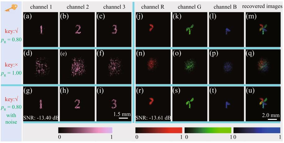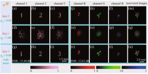Abstract:Optical encryption strategies utilizing fully coherent light have been widely explored but often face challenges such as speckle noise and beam instabilities. In this work, we introduce a novel protocol for multi-channel optical information encoding and encryption using vectorial spatial coherence engineering of a partially coherent light beam. By characterizing the beam’s spatial coherence structure with a \begin{document}$ 2 \times 2 $\end{document} coherence matrix, we demonstrate independent control over the three components of the coherence Stokes vector. This allows for three-channel optical information encoding and encryption, with applications in color image representation. Unlike existing methods based on fully coherent light modulations, our approach utilizes a two-point dependent coherence Stokes vector, proving resilient to random noise in experimental scenarios. Our findings provide a robust foundation for higher-dimensional optical encoding and encryption, addressing limitations associated with partially coherent light in complex environments. -